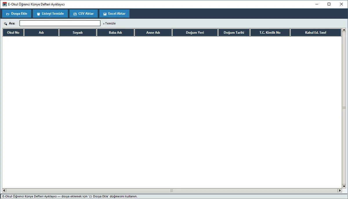 E-Okul'dan indirilen Öğrenci Künye Defteri Excel dosyalarını okuyarak öğrenci bilgilerini düzenli bir tabloya aktarır; arama, sıralama ve CSV/Excel'e dışa aktarma imkânı sunar.